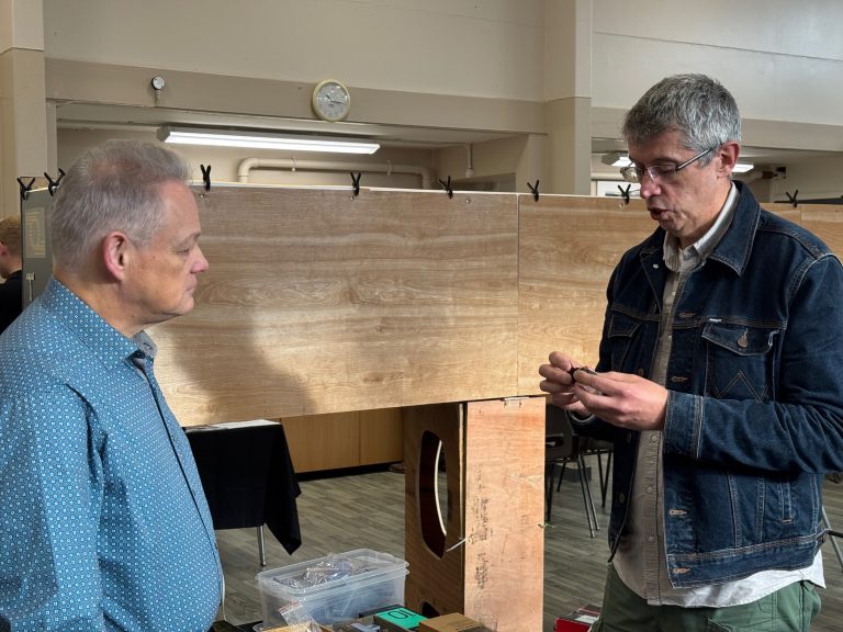 Ddydd Llun daeth Andrew N ag adeilad yr orsaf ar gyfer Cwm Carno, yn dilyn yr wyneb platfform a gyrhaeddodd yr wythnos diwethaf. Mae hyn yn seiliedig ar batrwm adeiladu Aberhonddu a Merthyr. Hefyd ddydd Llun fe wnaethon ni brofi’r ffasgiâu a’r cefndir ar gyfer Frecclesham a gwneud llanast wrth osod y cynhalwyr cefndir. Felly mae’r pyst unionsyth bellach wedi’u labelu ar gyfer eu hwyneb allanol a’u cyfeiriadedd.