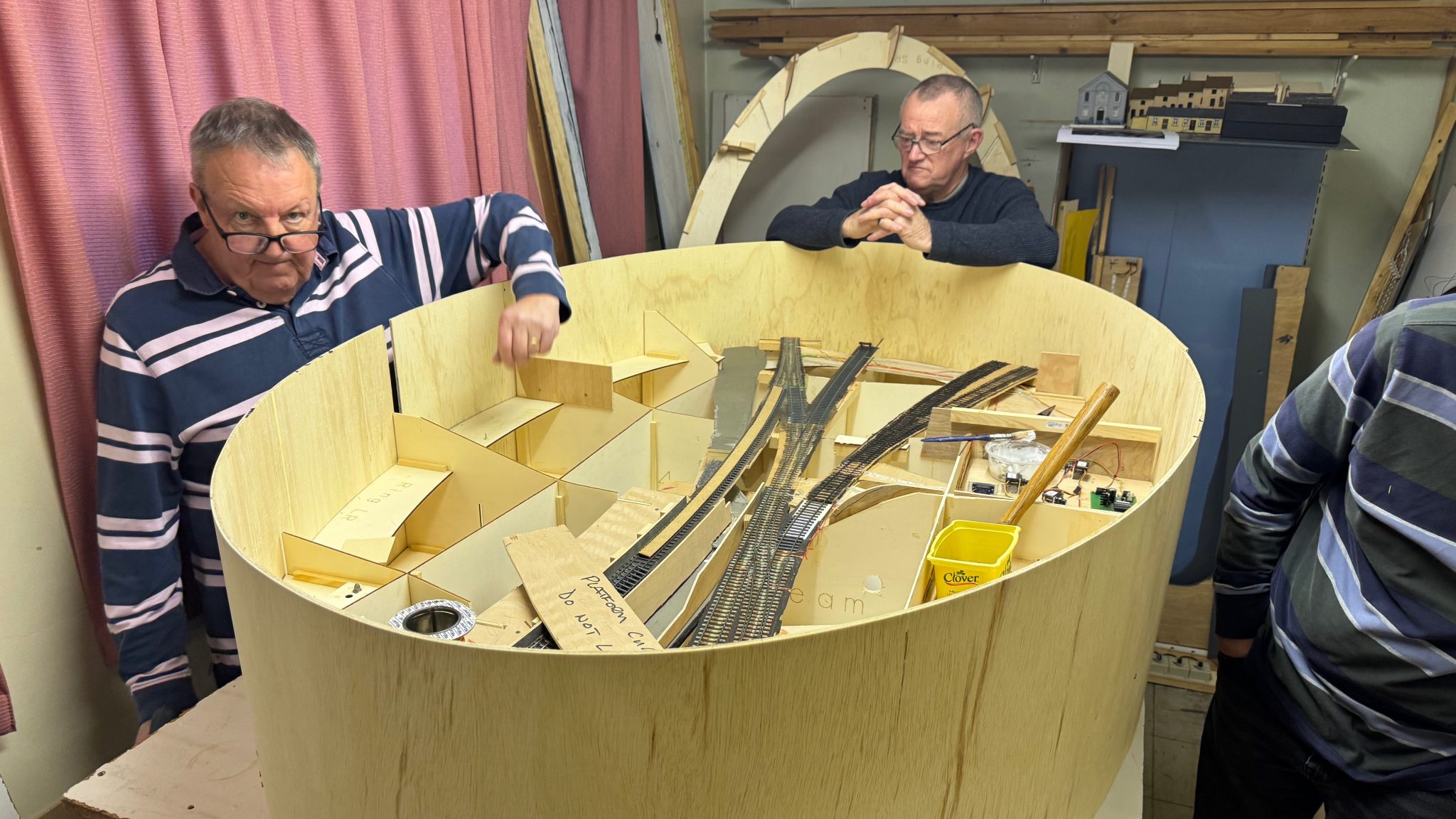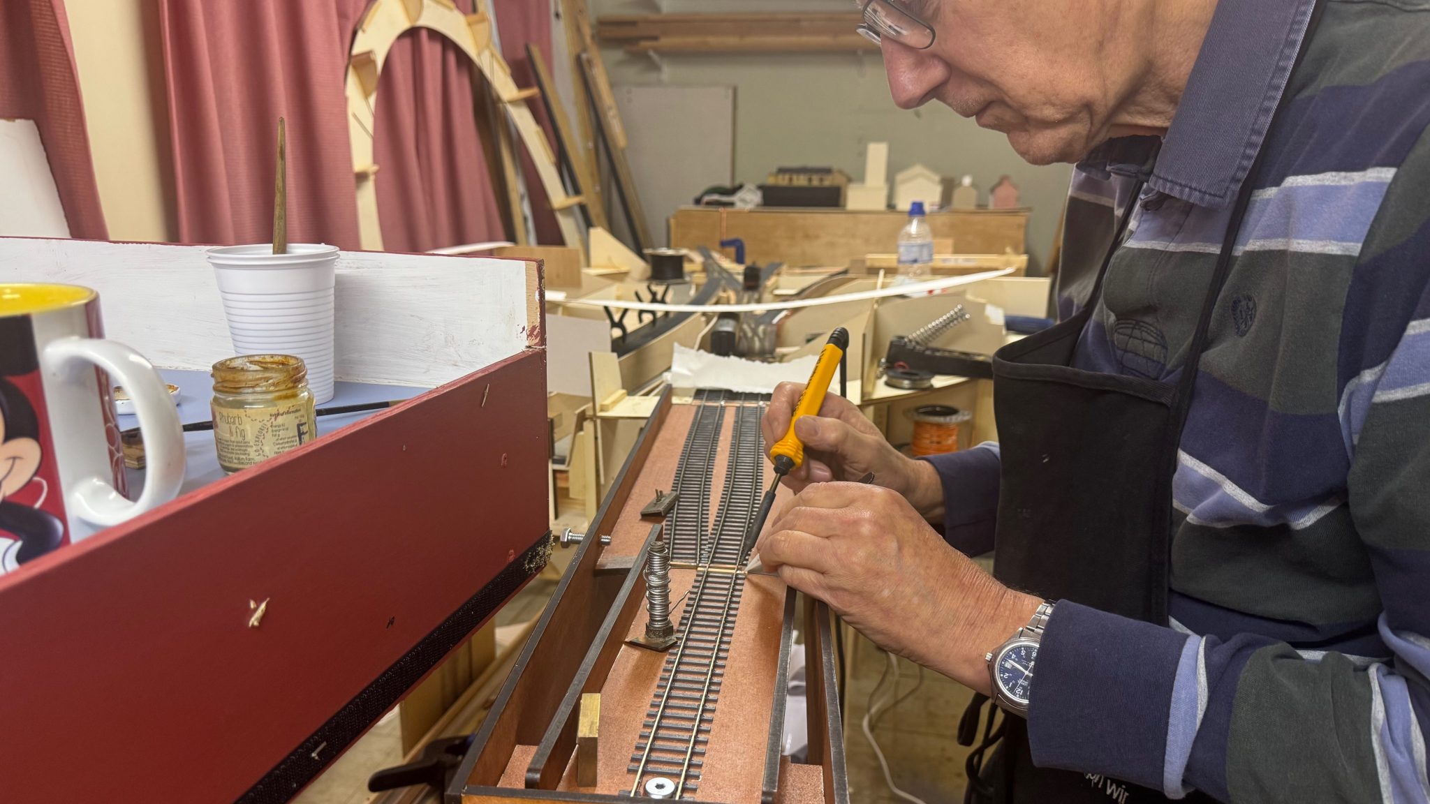 Ymhellach i mewn i’r llunwedd mae’r darn olaf o drac wedi’i osod, gan greu’r cysylltiad â’r lofa. Gallai’r sawl sydd â llygad craff weld camliniad bach. Nid yw’r trac hyblyg trawst plastig yn berffaith a bydd yn rhaid gosod rhywfaint o gefnogaeth ychwanegol.