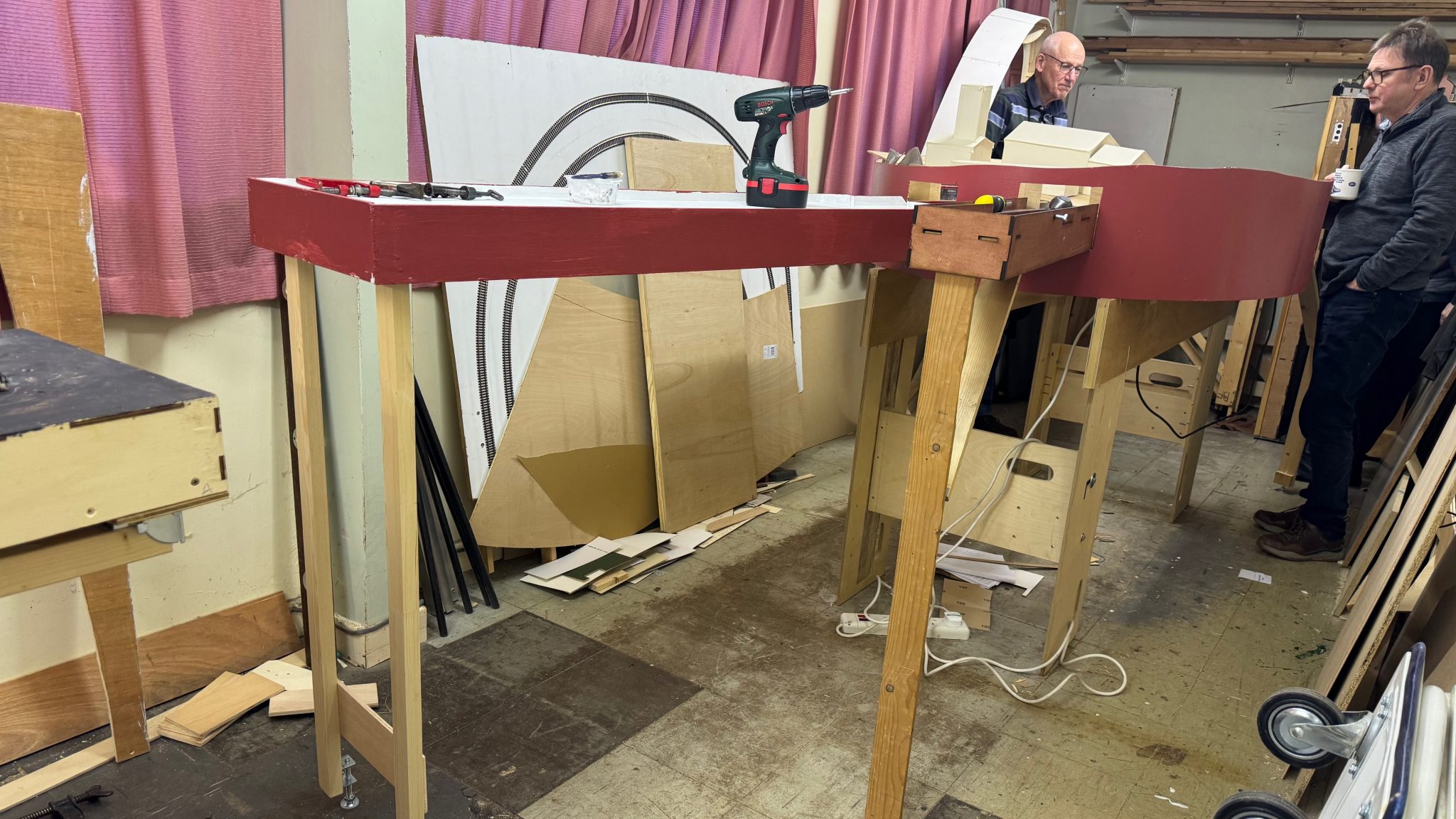 Hefyd ddydd Llun gwnaed ychydig o ad-drefnu. Gyda’r cydrannau ar gyfer byrddau sylfaen Sialens y Jiwbilî / Cwm Carno i fod i gyrraedd yr wythnos hon, o bosibl, crëwyd wyneb gwaith i alluogi adeiladu ar uchder rhesymol yn hytrach nag ymgreinio ar y llawr. Cymerwyd gofal i’w gael yn wastad braf.